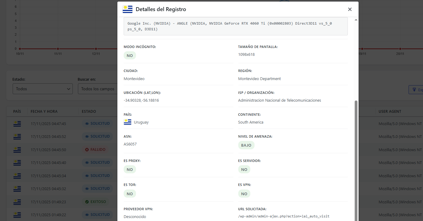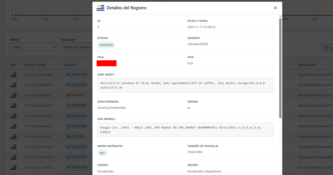 - Direccion IP capturada basada en posibles fugas de IP por webRTC