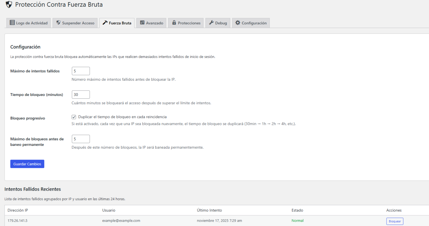 - opcion para bloquear direccion IP manualmente para prohibir nuevos intentos