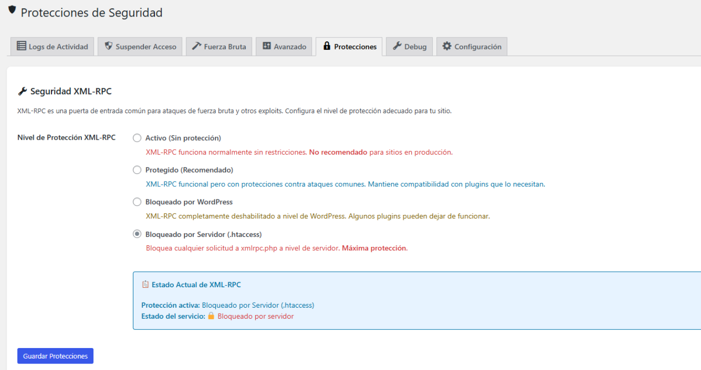- Seguridad XML-RPC contra ataques desde la API para logearse como un usuario
