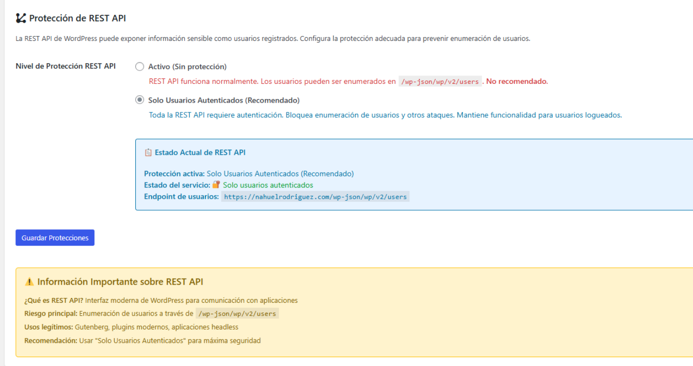 Dado que esta API es utilizada en algunos casos para conectar aplicaciones externas que necesitan algunos sitios webs para servicios (no es utilizado para nada normalmente) por lo que esta la opcion en el plugin de desactivarlo y bloquearlo por completo a nivel servidor o dejarlo con algunas protecciones.